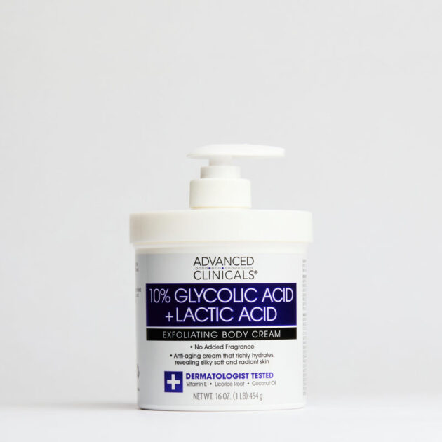 Advanced Clinicals 10% Glycolic + Lactic Acid Exfoliating Cream is a 16oz body moisturizer that combines 10% AHAs with squalane, licorice root, and vitamin E to remove dead skin cells and treat bumpy, dry skin or strawberry legs. Designed for daily use, it is a non-greasy, fragrance-free formula suitable for all skin types.