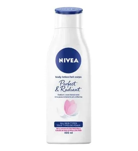 Nivea Perfect & Radiant Body Lotion is a lightweight daily moisturizer formulated with Vitamin C, Licorice extract, and SPF 15 to fade dark spots, even skin tone, and boost radiance. It is non-greasy, fast-absorbing and has a fresh scent, making it ideal for normal to oily skin, though it may be too light for very dry skin.